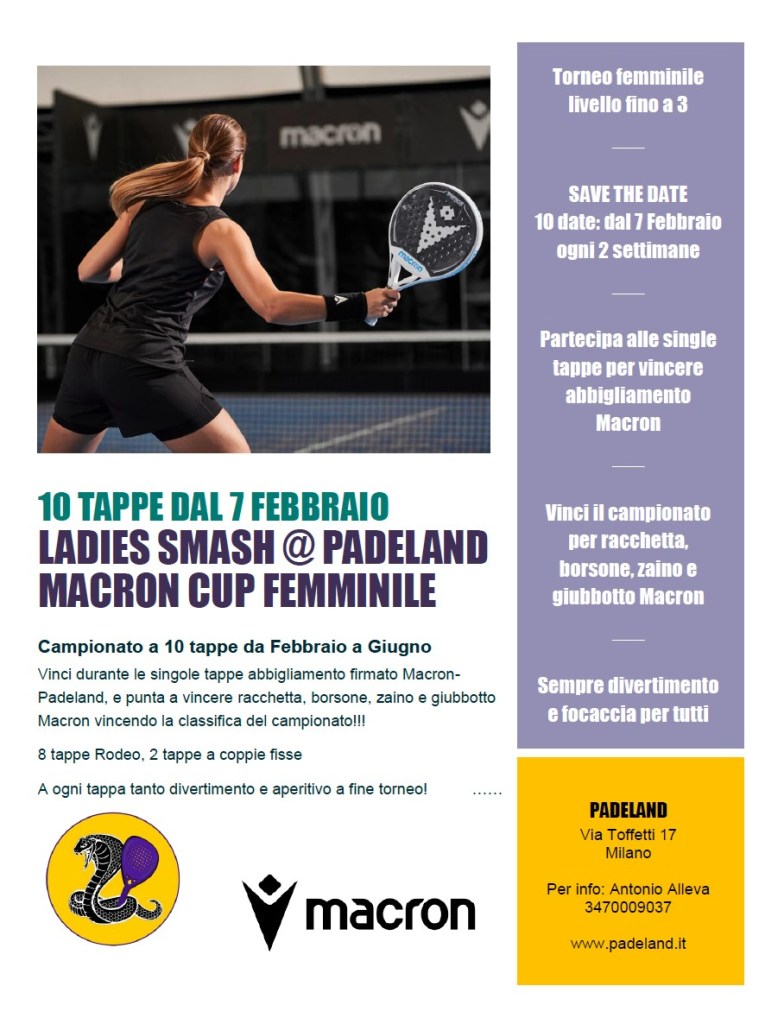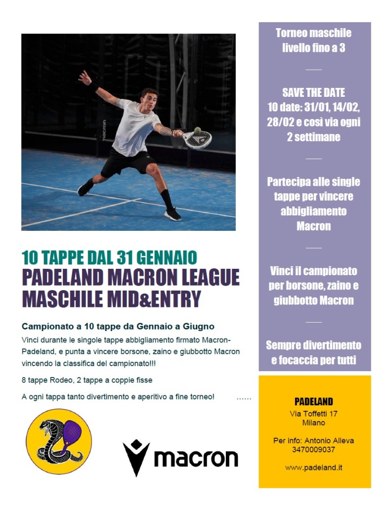 Iscriviti alle singole tappe, ricche di divertimento e premi firmati Padeland-Macron, e prova anche a accumulare punti per l’intero campionato: in palio una racchetta di livello TOP!